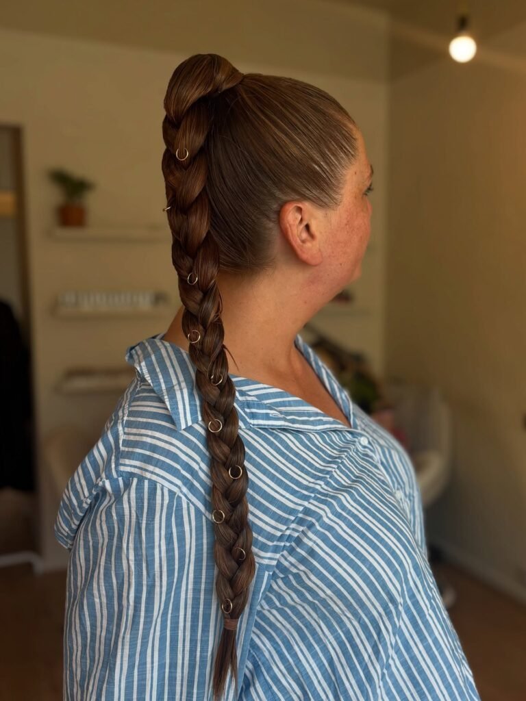 From the ponytail base, the hair is braided into one long, thick plait that cascades dramatically down the back — and here is where the real artistry begins. Delicate gold rings are threaded along the braid at evenly spaced intervals, catching the light at every turn and adding a jewelry-like elegance that transforms a classic braid into something genuinely special.