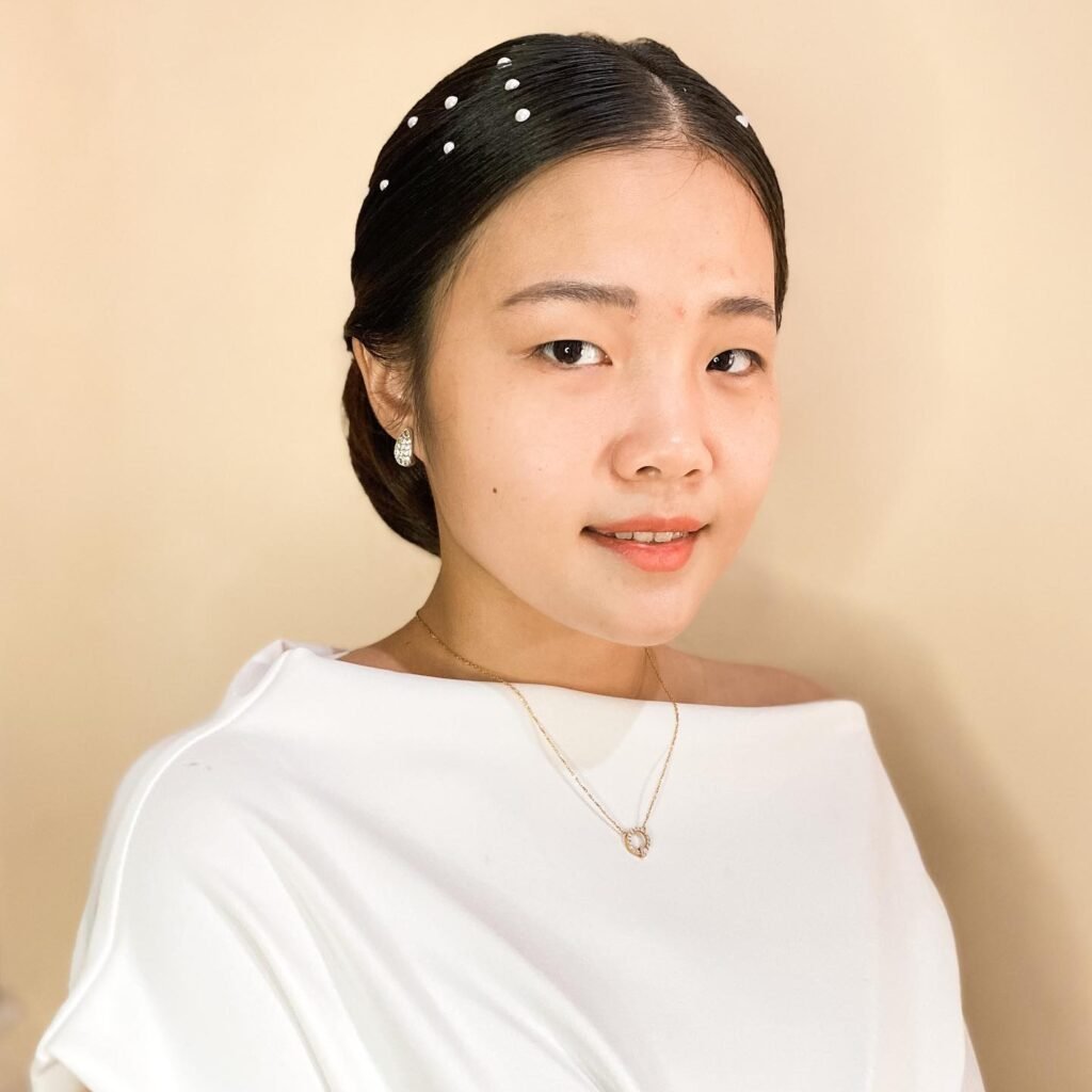 Delicate, graceful, and timelessly bridal — this slicked-back low bun adorned with scattered pearl pins is the perfect example of how minimalist styling can achieve maximum elegance. The hair is swept back smoothly from the hairline with a light-hold gel that creates a clean, polished surface without the stiffness of a heavy product finish. Every strand lays neatly against the head, following the natural curve of the skull before gathering into a neatly coiled low bun that sits close to the nape with quiet, refined poise.