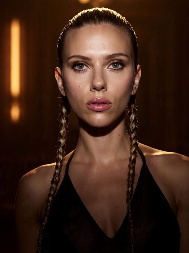 The hair then divides into two sleek, evenly matched braids that drape down the front of each shoulder — thin, tight, and precisely plaited with a firmness that mirrors the slicked-back tension of the crown perfectly.