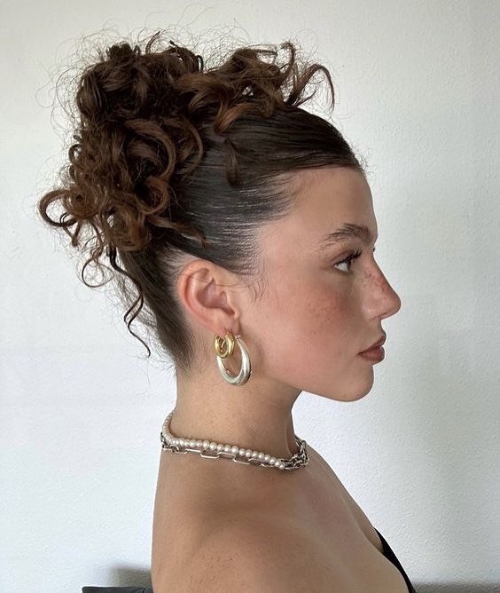 Combining sleek control with natural texture, this slicked-back curly updo offers the perfect balance between elegance and playful volume. The hair is smoothly pulled back at the roots, creating a clean and refined front profile, while the curls are left full and expressive at the crown for added dimension and personality.
