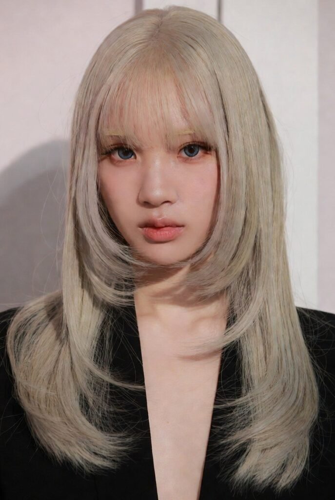 The cool-toned blonde feels fresh and youthful, while the fringe adds personality and frames the eyes beautifully.