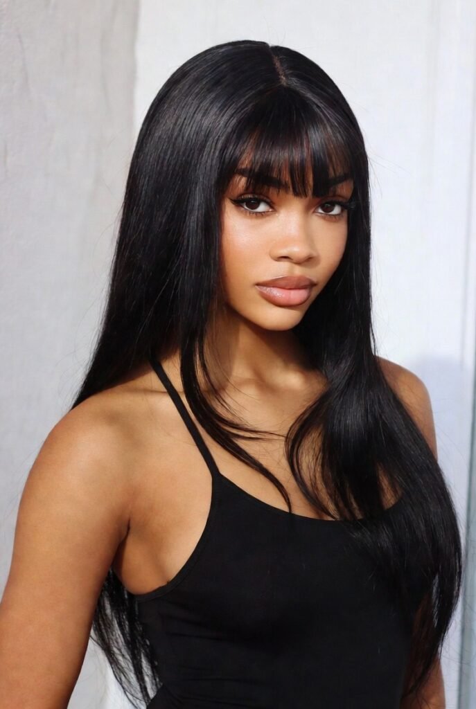 Full, heavy bangs paired with glossy black hair creates a timeless, striking combination. The straight styling emphasizes the shine and health of the hair.