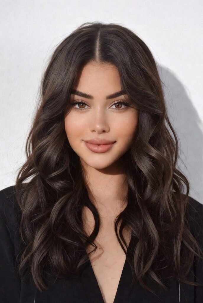 Deep, rich brown hair styled in relaxed curls delivers romance and sophistication in equal measure.