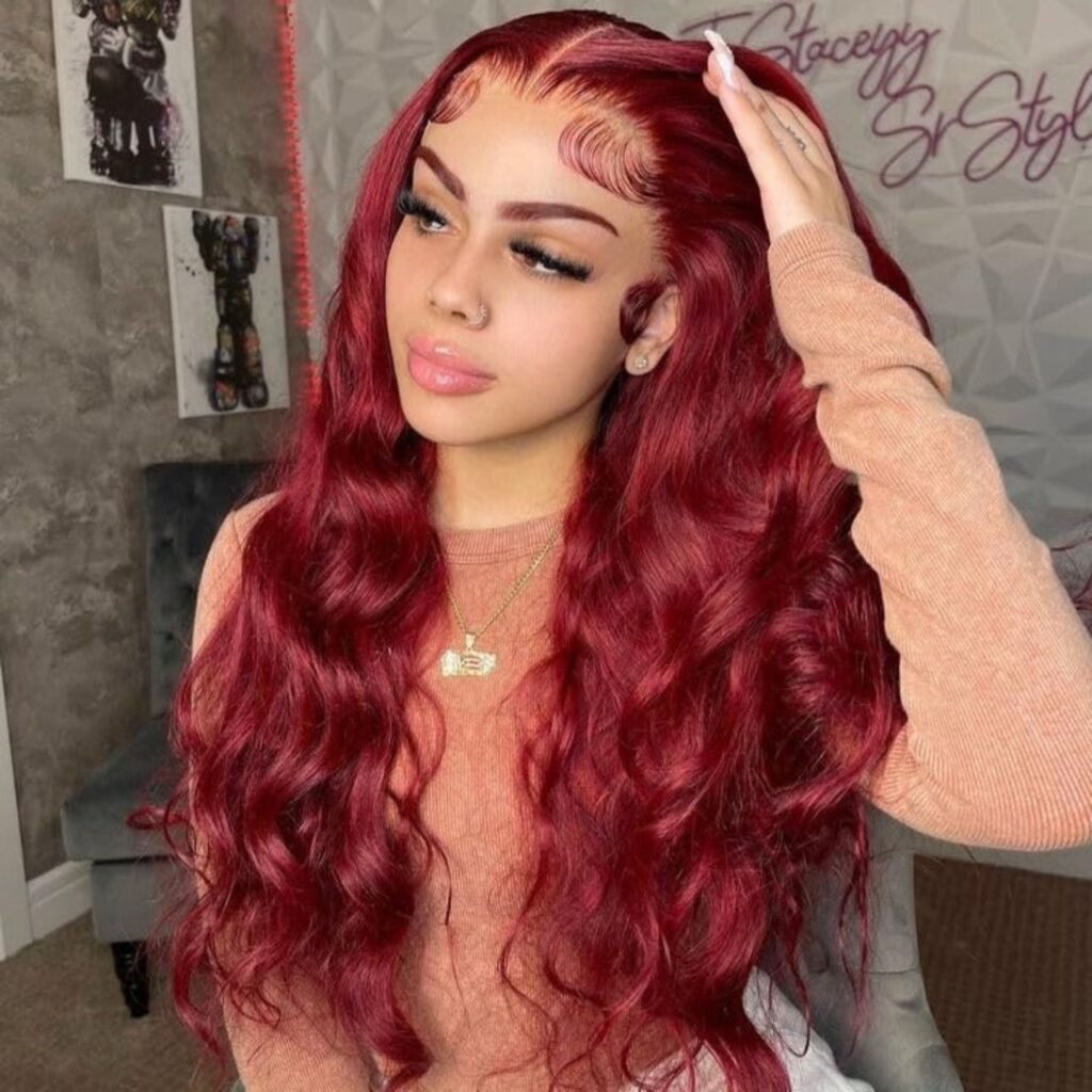 I cannot get over how bold and stunning this deep red lace frontal hairstyle looks from the very first glance. The rich burgundy color runs through long, voluminous body waves that fall dramatically over the shoulders and instantly make the entire look feel glamorous, confident, and completely unforgettable.