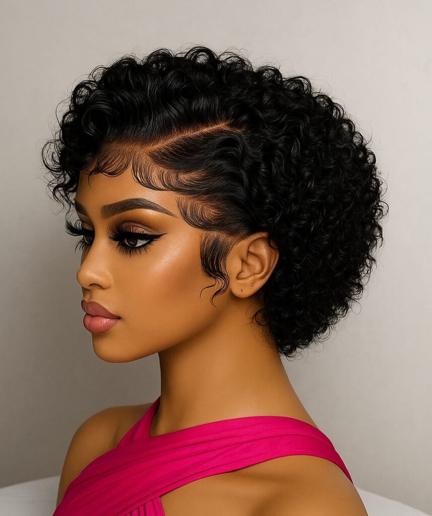 I think short lace frontal hairstyles are seriously underrated and this image shows exactly why. The combination of sculpted edges, rich curl texture, and flawless hairline finish makes this one of the most striking and well executed installs I have come across.
