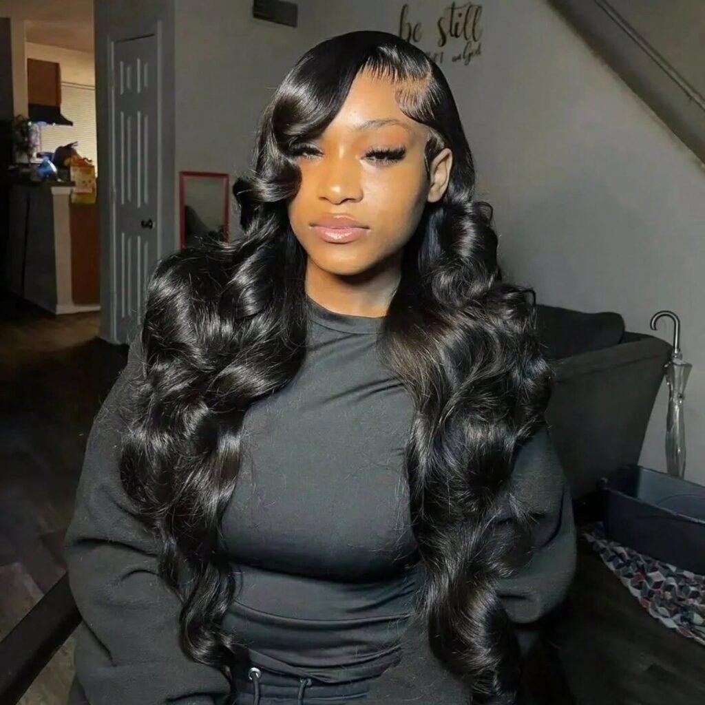 I keep coming back to this body wave lace frontal hairstyle because the sheer volume and bounce of those dark waves is absolutely breathtaking. The hair falls in massive, glamorous waves all the way to the waist and frames the face in a way that looks incredibly full and lush from every angle.