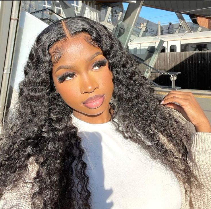 I find this outdoor deep wave lace frontal hairstyle so striking because the natural light hits those long dark curls in the most beautiful way. The center part runs clean and precise from front to back, giving the whole install a symmetrical, editorial quality that looks incredibly professional.