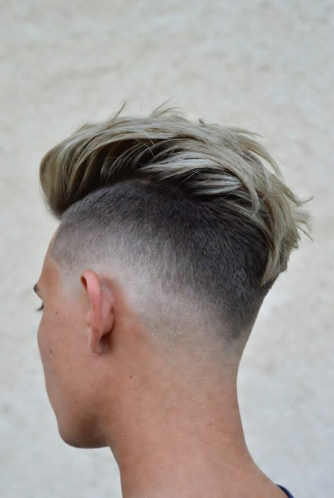 The color contrast between the dark roots showing through the fade and the blonde top creates additional visual interest.