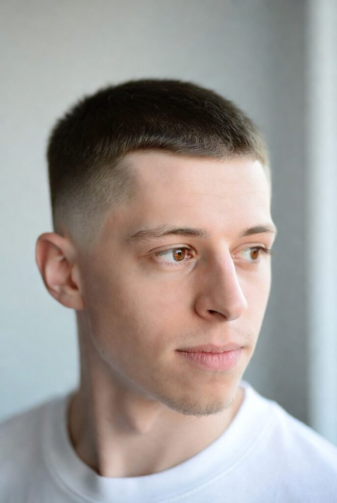 The hair is clipped uniformly close to the scalp, creating a neat, masculine look that works great in hot weather or for guys who prefer minimal fuss.