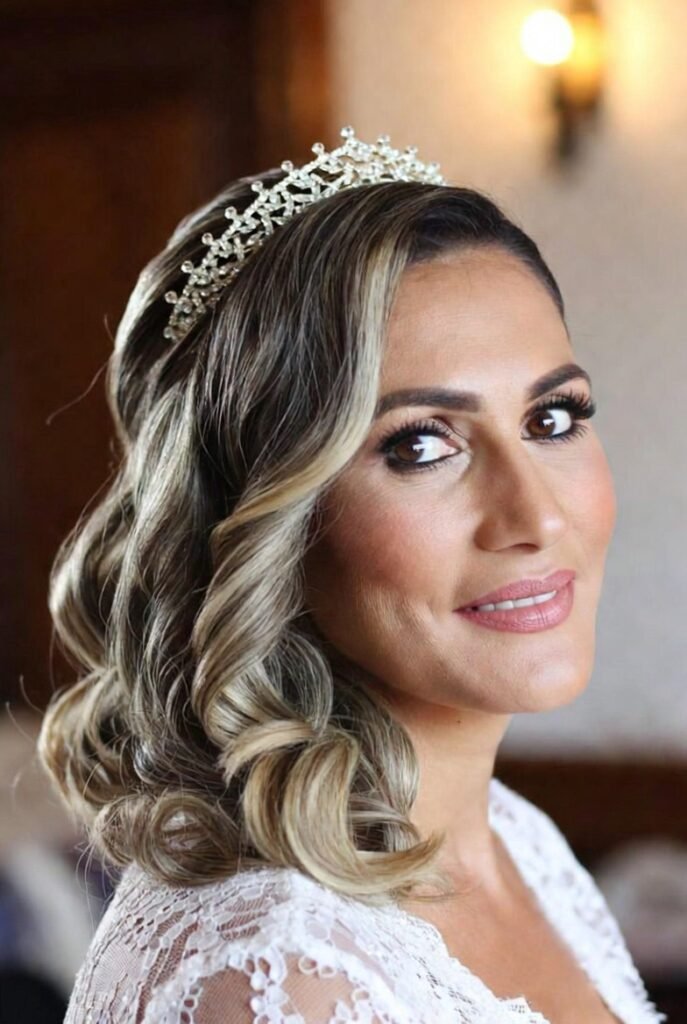 This glamorous style features hair elegantly arranged in waves and secured with a stunning crystal crown.