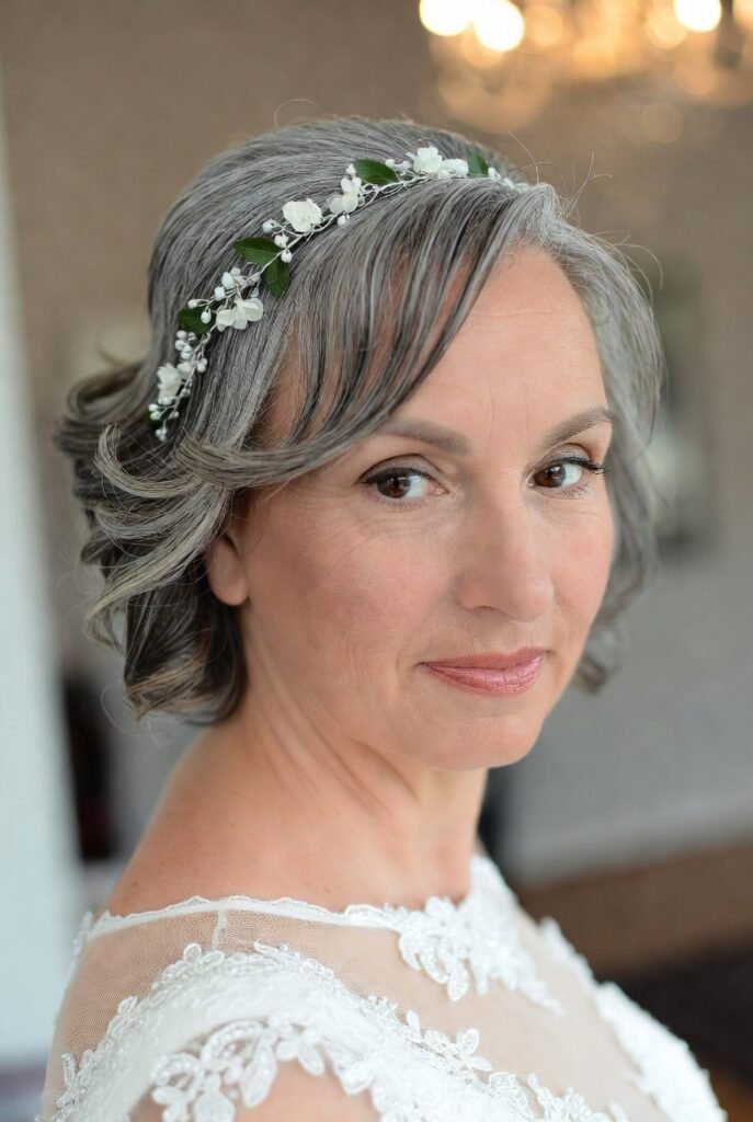 A delicate floral hair piece adds a romantic touch positioned where it enhances rather than dominates.