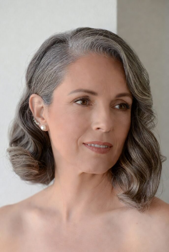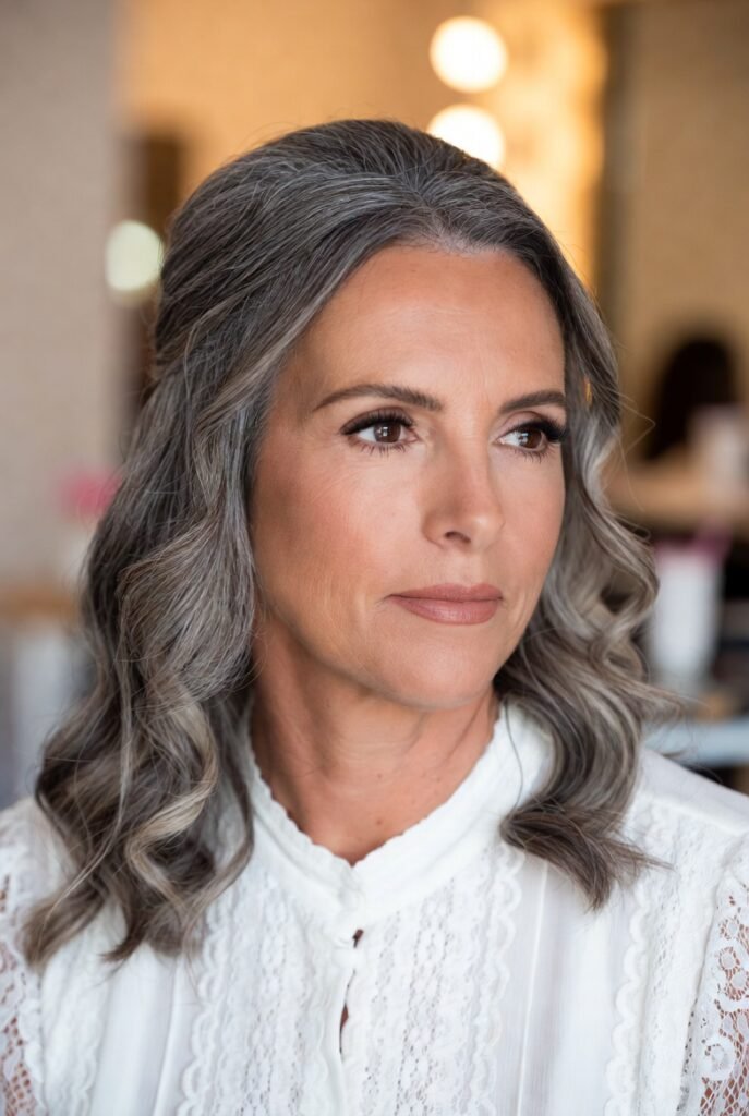 This style beautifully showcases natural gray and silver tones, proving that mature hair can be absolutely stunning.