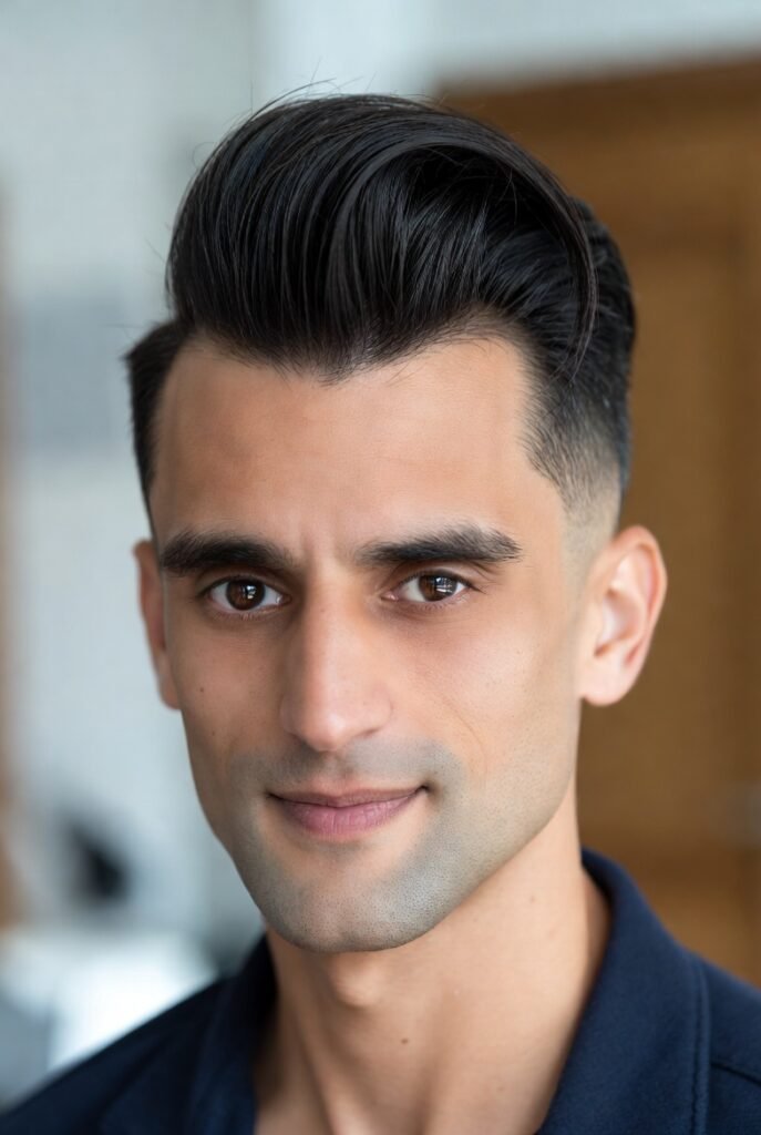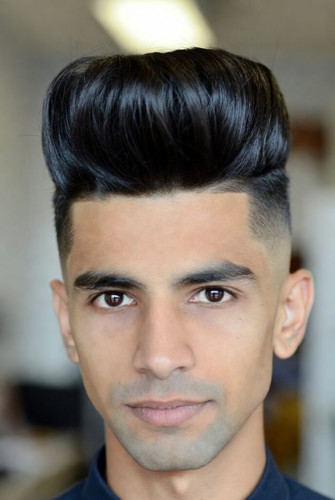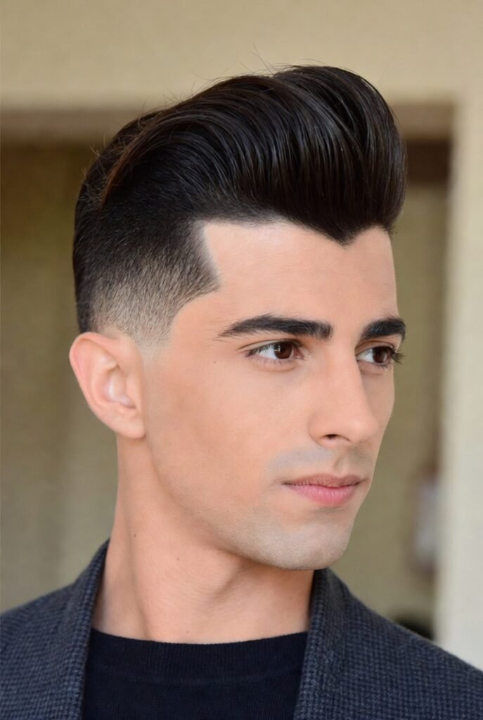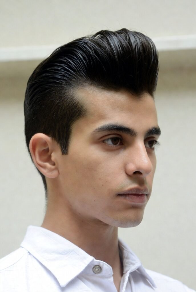This timeless look screams confidence with its dramatic height and sleek finish. The hair is swept back and upward, creating impressive volume at the front while the sides remain neatly tapered.