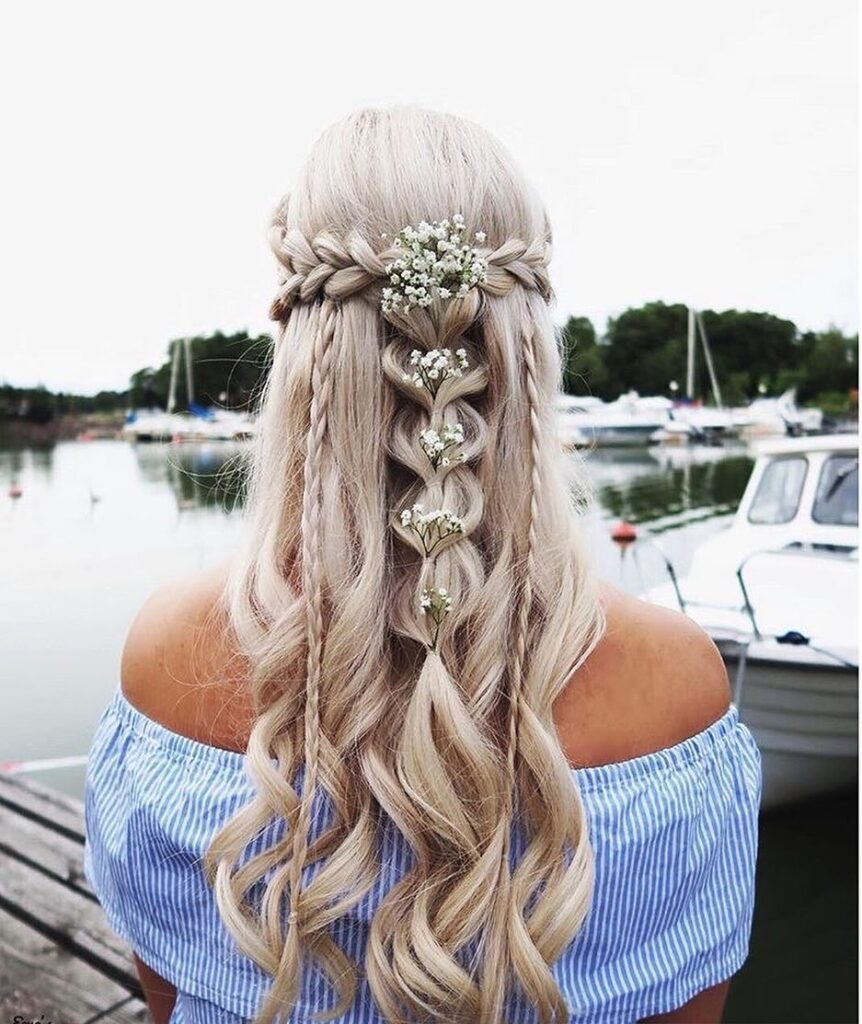The floral crown bun offers a classic and elegant approach to princess hairstyles. Hair is gathered into a sophisticated low bun, artfully twisted and secured, and then beautifully encircled with a fresh garland of delicate white baby’s breath flowers. It is a vision of natural beauty.