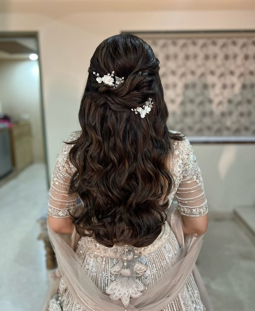 This captivating princess hairstyle is a fantastic choice for those who desire elegance without a full updo. It is versatile enough for both formal events and chic celebrations, radiating effortless glamour. The floral details add a touch of romance to this flowing, luxurious style.