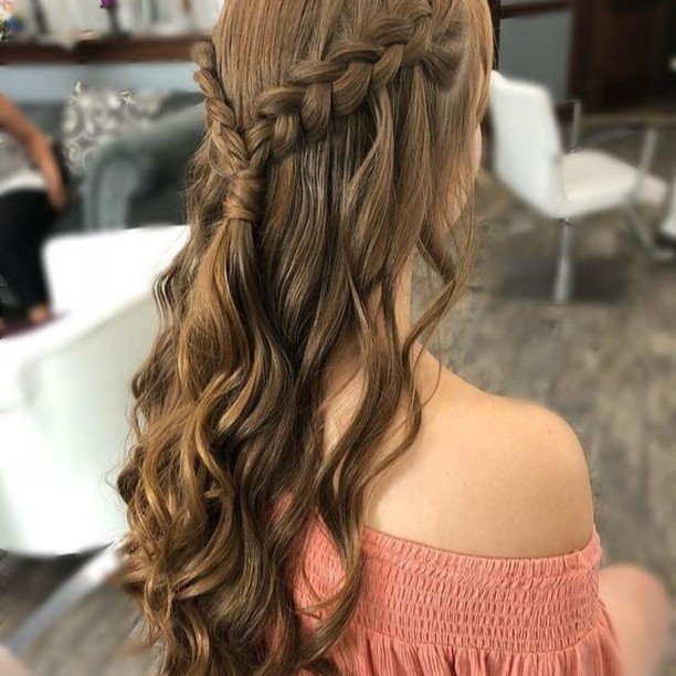 The waterfall braid waves provide a charming and flowing option within princess hairstyles. Delicate braids are woven across the crown, gracefully blending into long, soft waves that cascade down the back. Loose strands frame the face for a gentle touch.