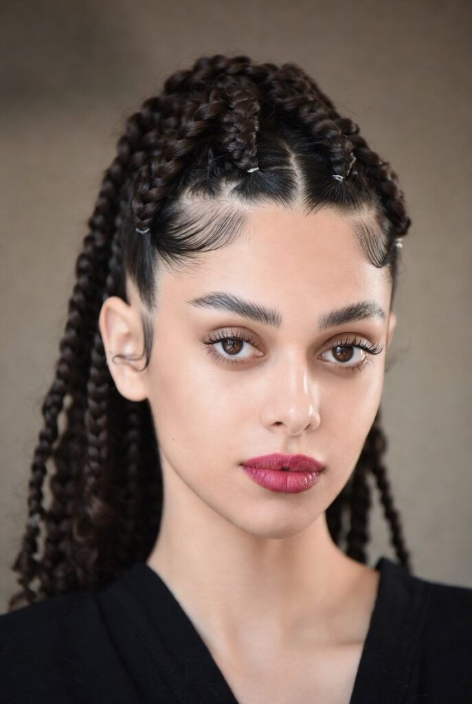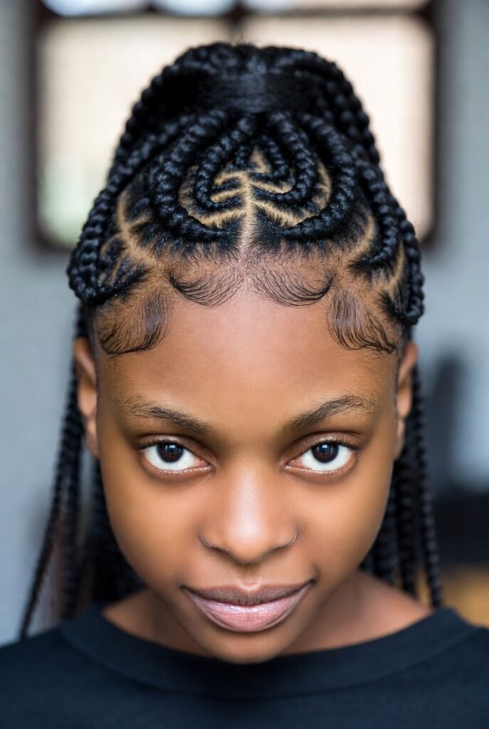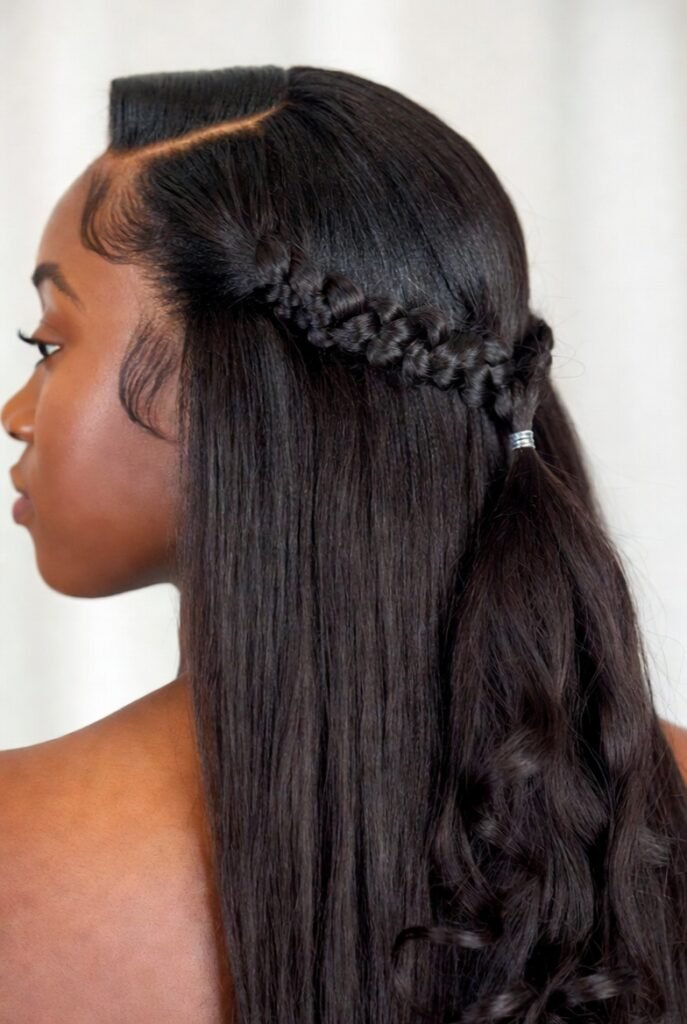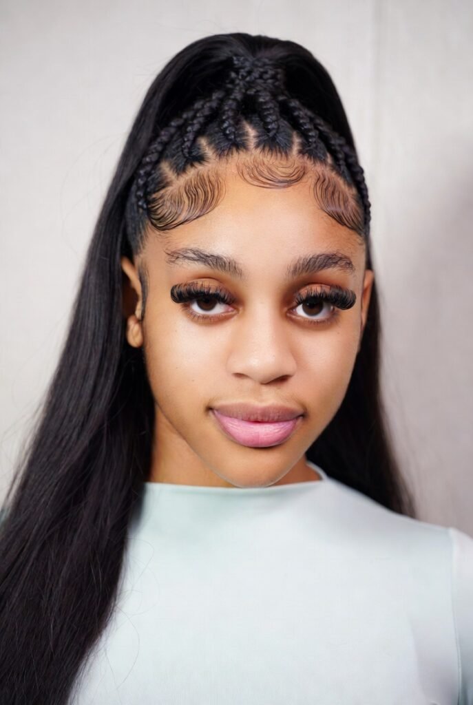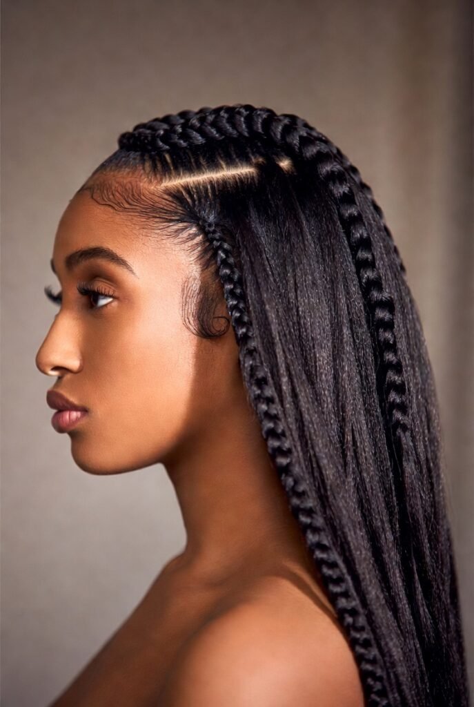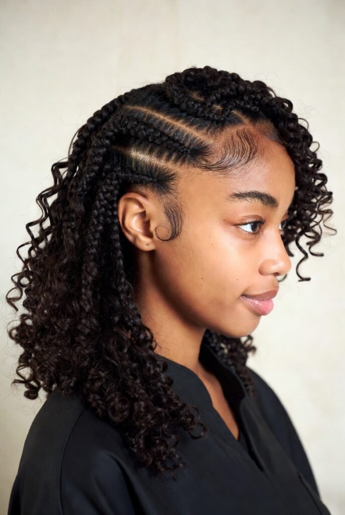 The loose, flowing hair balances the structured braiding, resulting in a look that’s both protective and pretty.