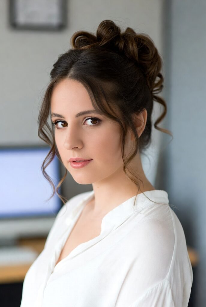 The style keeps hair controlled and professional while adding a feminine touch that softens work attire.