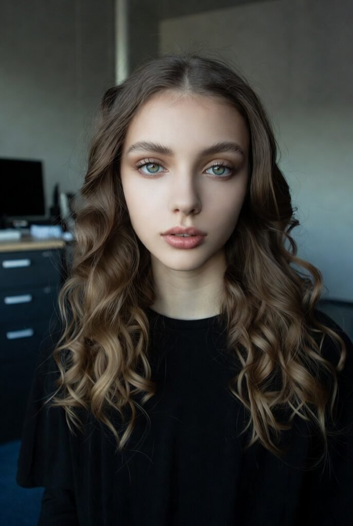 The hair transitions from darker roots to lighter, warmer tones toward the ends, creating visual interest before it’s even styled.