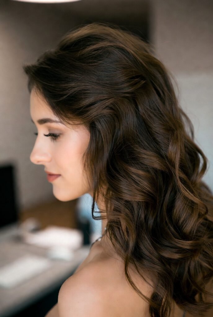 The romantic quality comes from those deliberately placed curls that add femininity and elegance to the overall presentation.