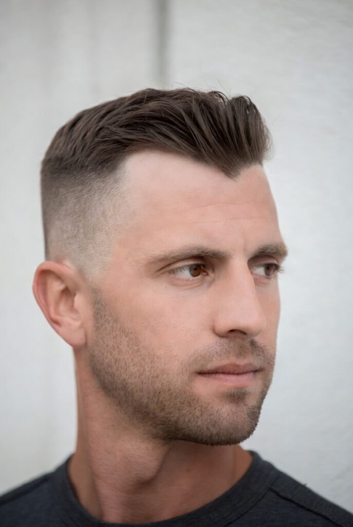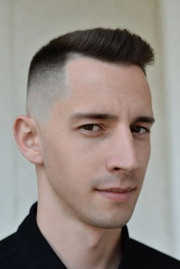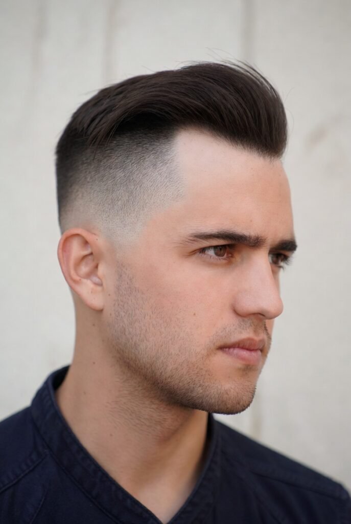 The short, forward-styled top creates subtle height without being theatrical, while the tight fade keeps everything grounded and clean.