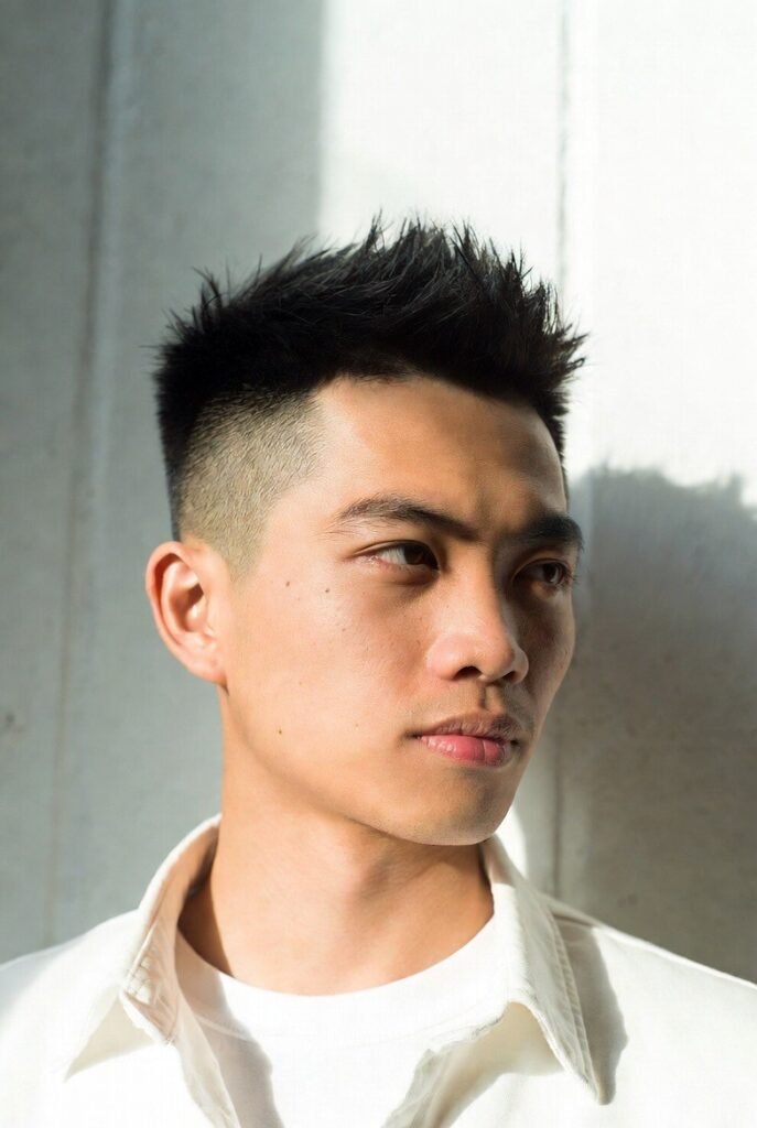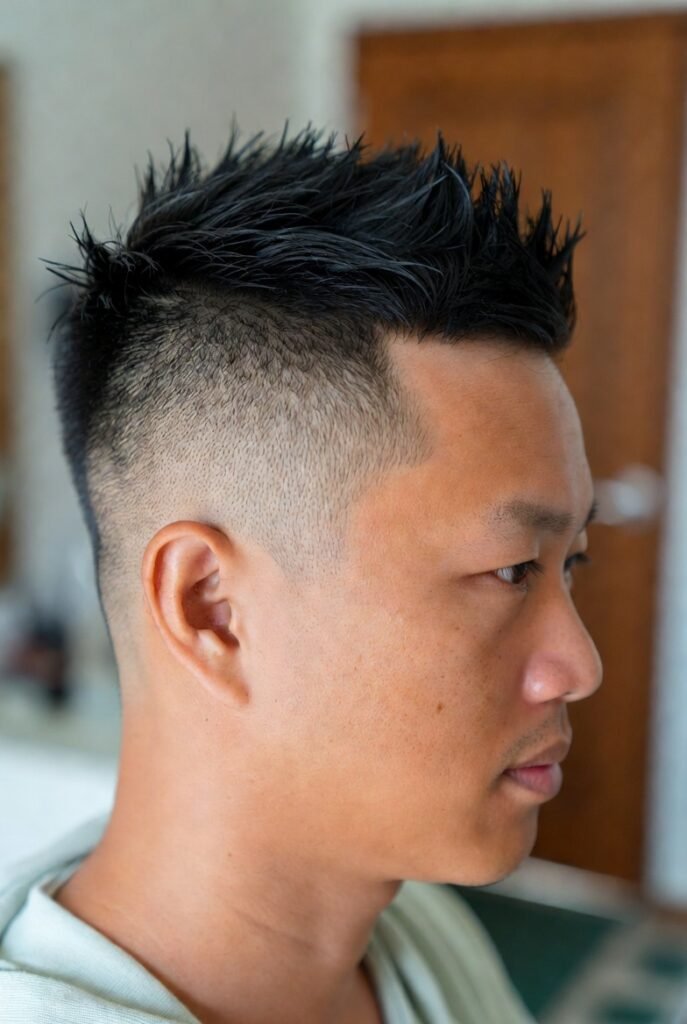 The dramatically spiked top creates vertical interest while the aggressive fade keeps everything grounded and contemporary.