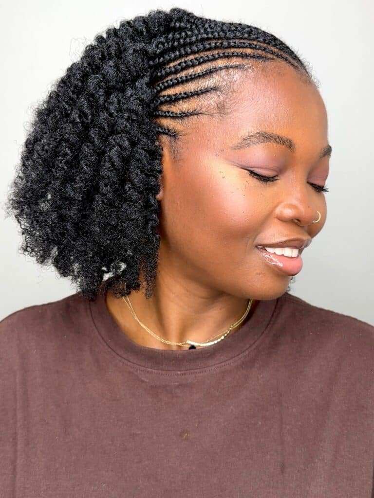 Where the cornrows end, chunky two-strand twists take over, unraveling into a full, voluminous twist-out bob that falls just at the jaw. The texture is rich and coily, with each section holding its definition while still blending seamlessly into a cohesive shape. The contrast between the sleek, braided crown and the lush, free-formed ends is what makes this style so visually compelling.