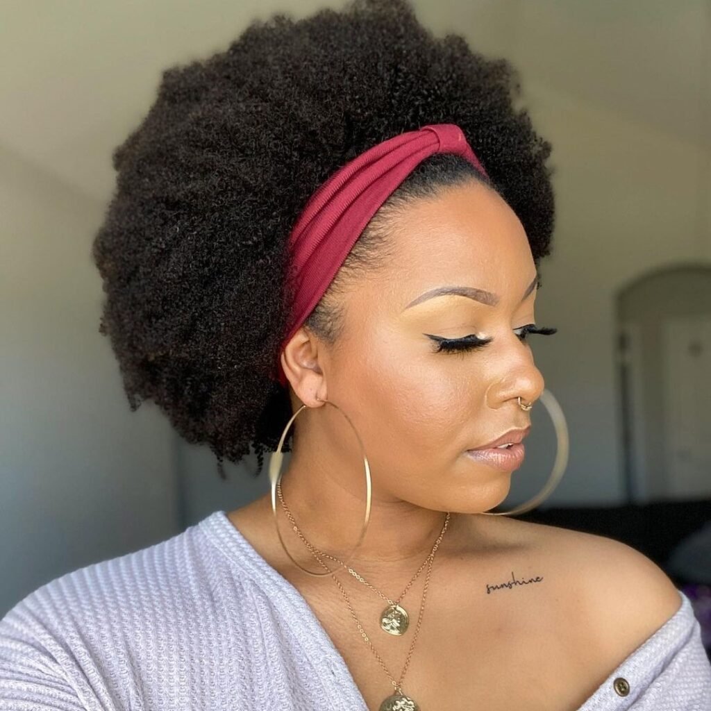 A deep crimson twist headband does all the right things here — anchoring the hair back at the temples while allowing the full, rounded afro to rise beautifully above it. The 4C coils are left completely free and unmanipulated, showcasing their natural density and rich black depth. The volume is evenly distributed, creating that coveted cloud-like silhouette that makes short 4C hair so undeniably striking.
