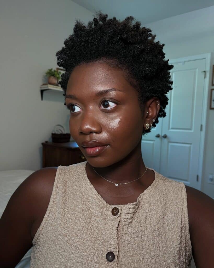 The sides taper subtly, keeping the shape controlled while still maintaining that coveted big-hair energy at the crown. Paired with gold hoop earrings and a flawless beat, this look radiates confidence from every angle. It’s a masterclass in how short 4C hair, when styled with intention, can rival any long hairstyle in sheer impact and elegance.