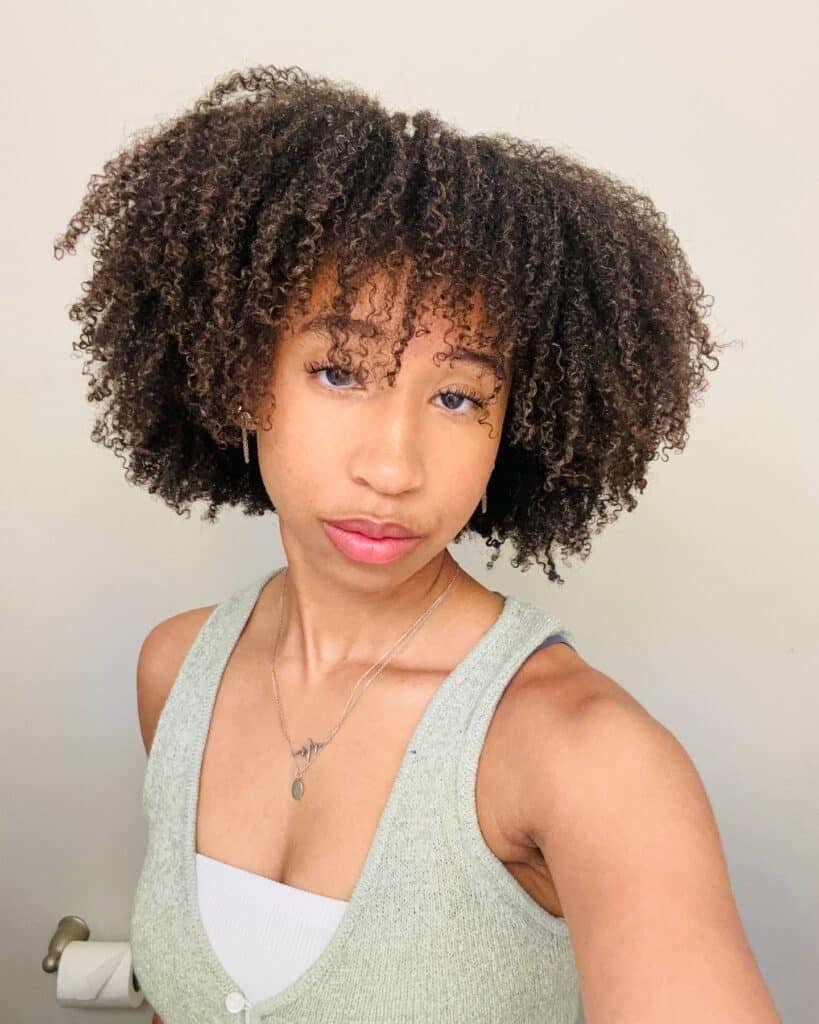 The bangs are neither too heavy nor too structured — they fall naturally, with individual coils springing forward and adding a playful, lived-in charm that perfectly complements the boldness of the overall silhouette.
