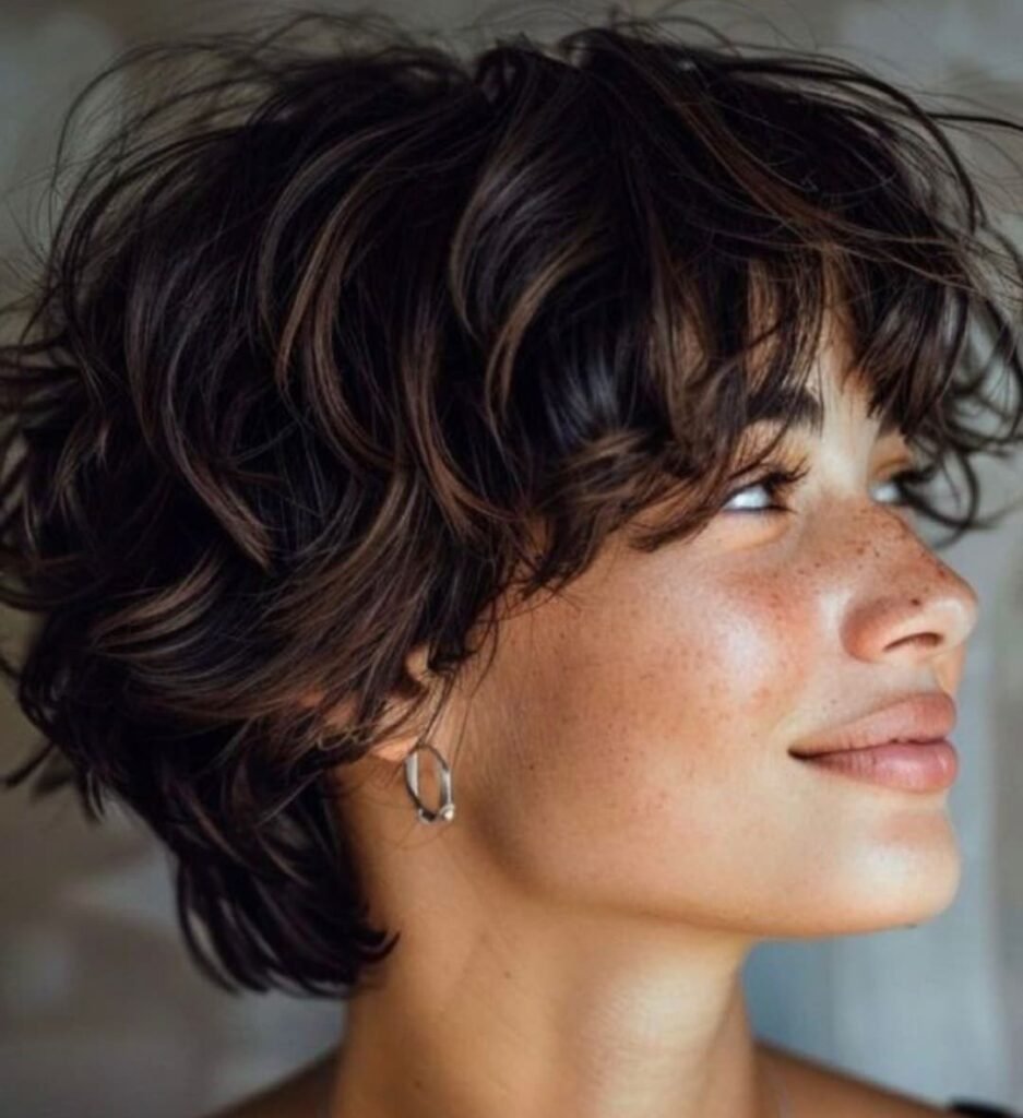 The effortless shaggy pixie is all about natural texture and relaxed charm. Loose, wavy curls create a soft, tousled appearance, with a wispy fringe gently falling over the forehead. This look feels fresh and unconstrained.