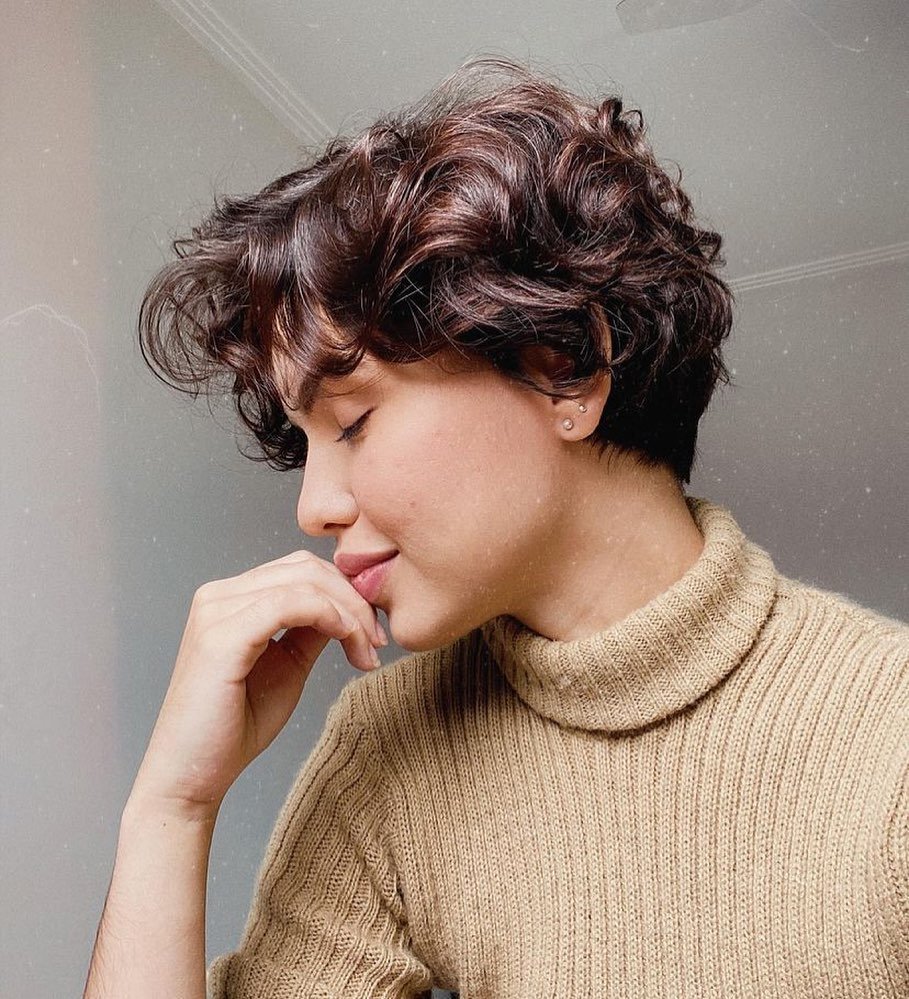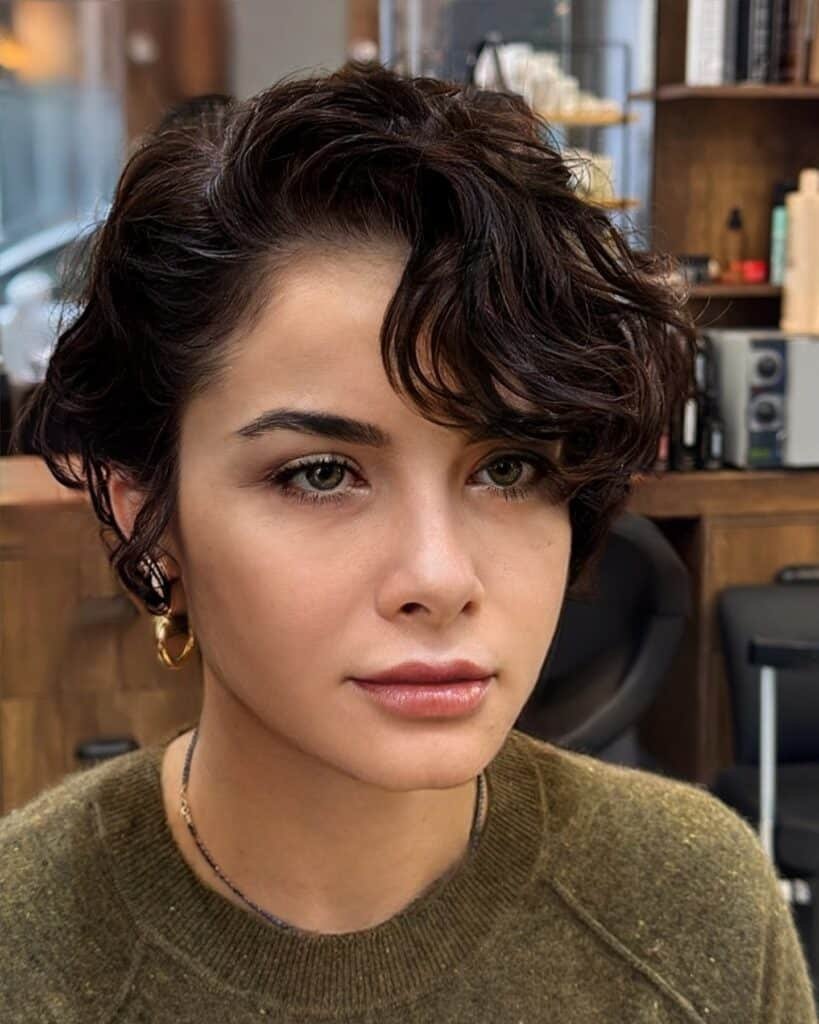 This curly pixie cut offers a glamorous take on short hair, demonstrating how a touch of styling can elevate the look. It is an excellent choice for those seeking a sleek yet voluminous style that exudes confidence. The rich brown color adds to its polished appeal.