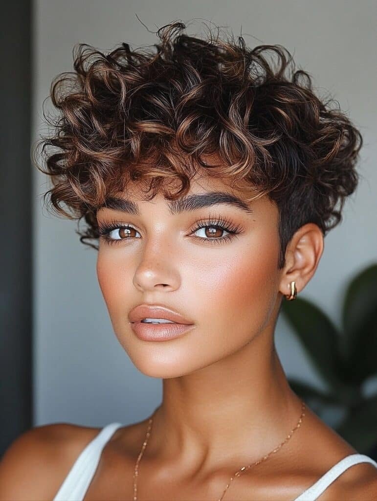This curly pixie cut is fantastic for making natural curls truly pop, catching the light with every bounce. It is a stylish choice for those seeking a fresh, energetic hairstyle that embraces texture. The highlights add a touch of warmth and glow.