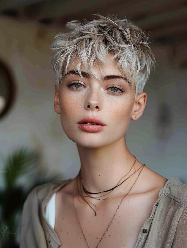 The effortless shaggy pixie is all about natural texture and relaxed charm. Loose, wavy curls create a soft, tousled appearance, with a wispy fringe gently falling over the forehead. This look feels fresh and unconstrained.