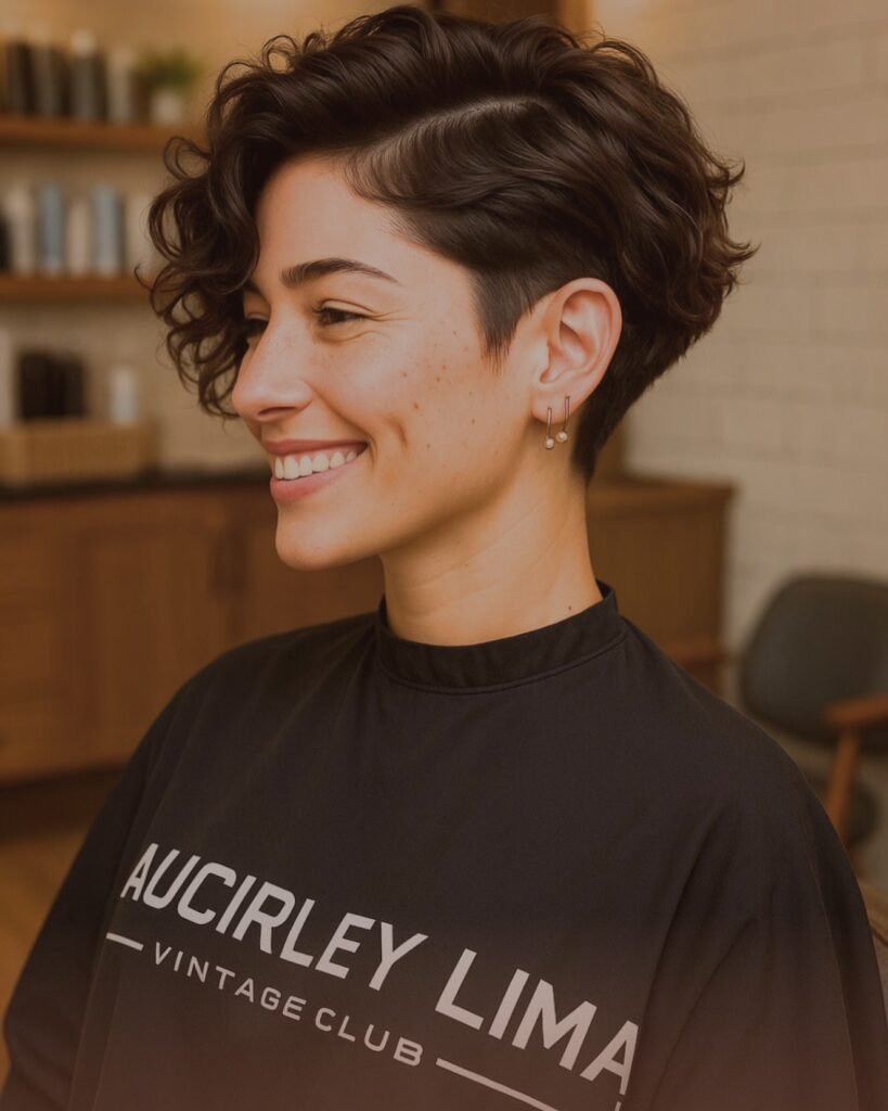 This curly pixie cut demonstrates how short hair can still exude sophistication and movement. It is a wonderful option for adding volume and a touch of drama. The style works well for various occasions, radiating charm and confidence.