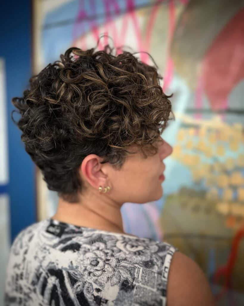 This curly pixie cut is an excellent choice for adding vibrancy and dimension to your hair. It frames the face beautifully, enhancing features with its playful yet chic structure. The highlights make the curls truly sparkle.
