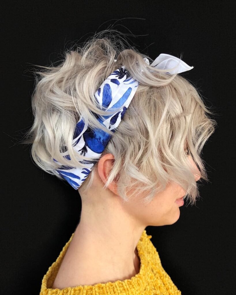 This wavy bandana pixie offers a chic and playful twist on short hair. The soft, textured waves are styled with volume, complemented by a stylish bandana that adds a touch of retro charm. It’s a fun way to accessorize a short cut.
