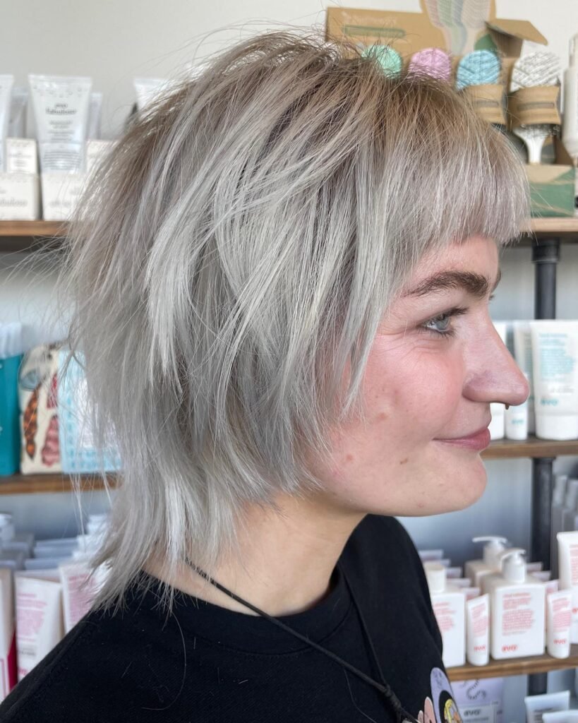 The light color emphasizes every piece and layer, showcasing the haircut’s intricate detail work. Despite its edgy appearance, it’s surprisingly wearable for everyday life.