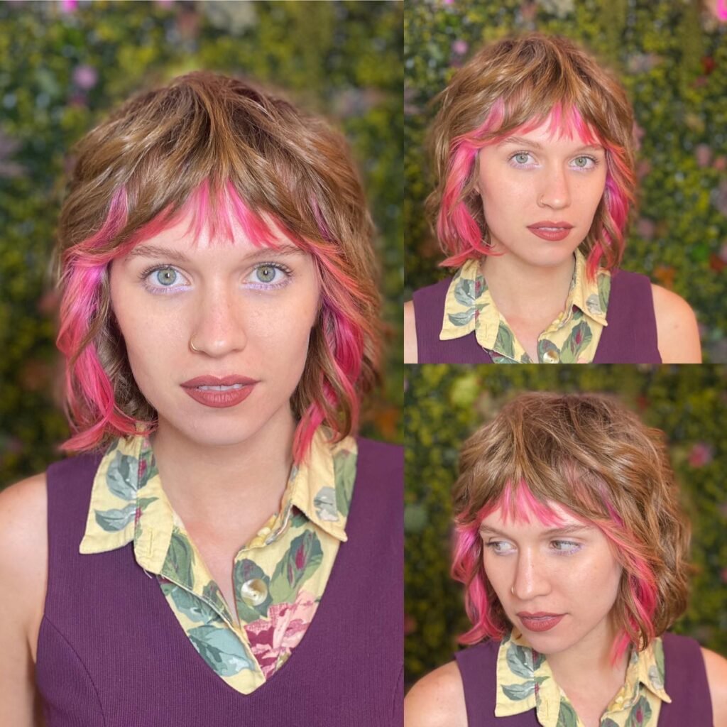 What makes this work so well is the balance—the pink adds personality without overwhelming, while the shaggy cut keeps everything feeling relaxed and approachable rather than overly styled.