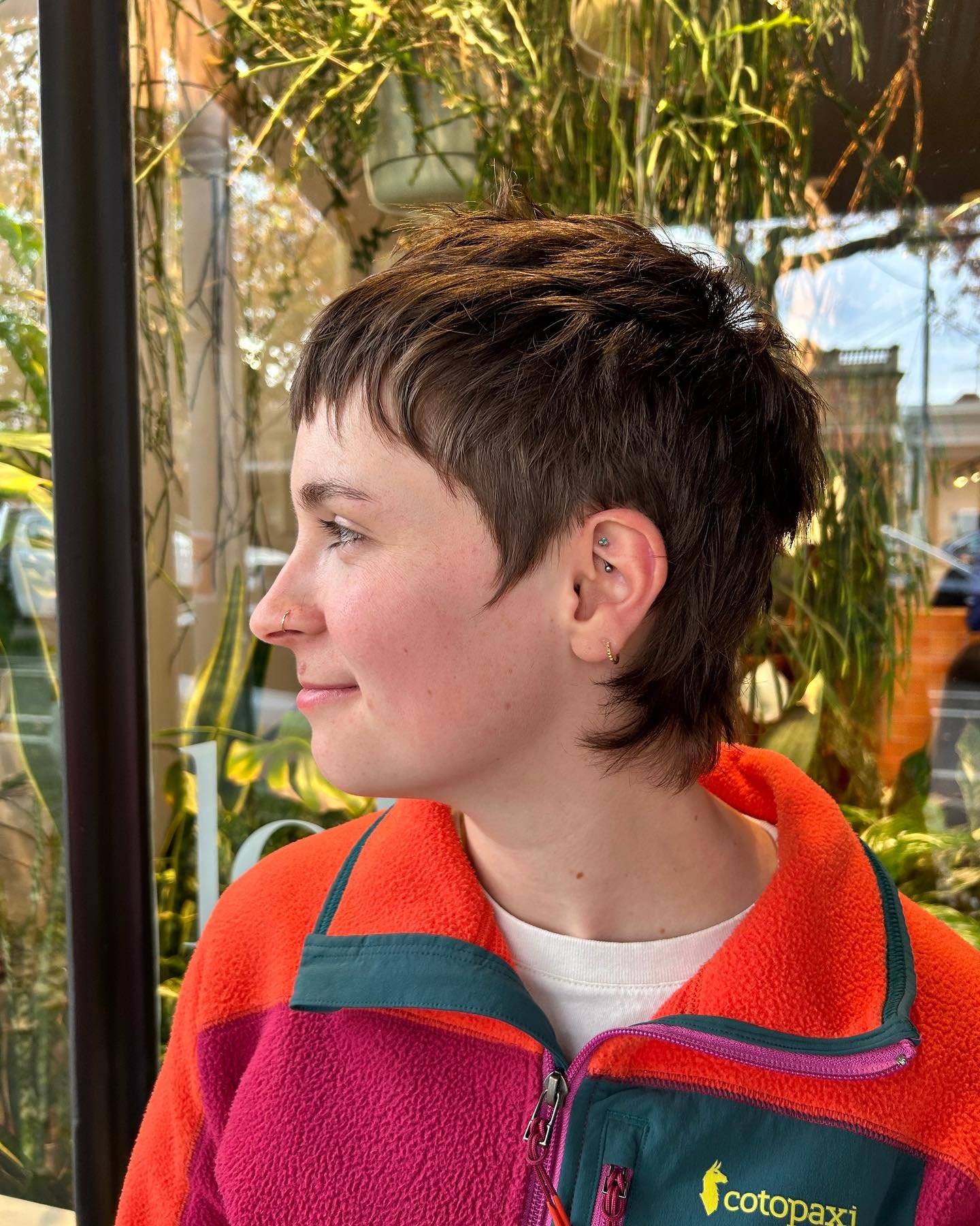 There’s a wonderful androgynous quality here that feels confident and modern. The warm red-orange tones catch the light beautifully, making the whole style feel vibrant and full of energy.