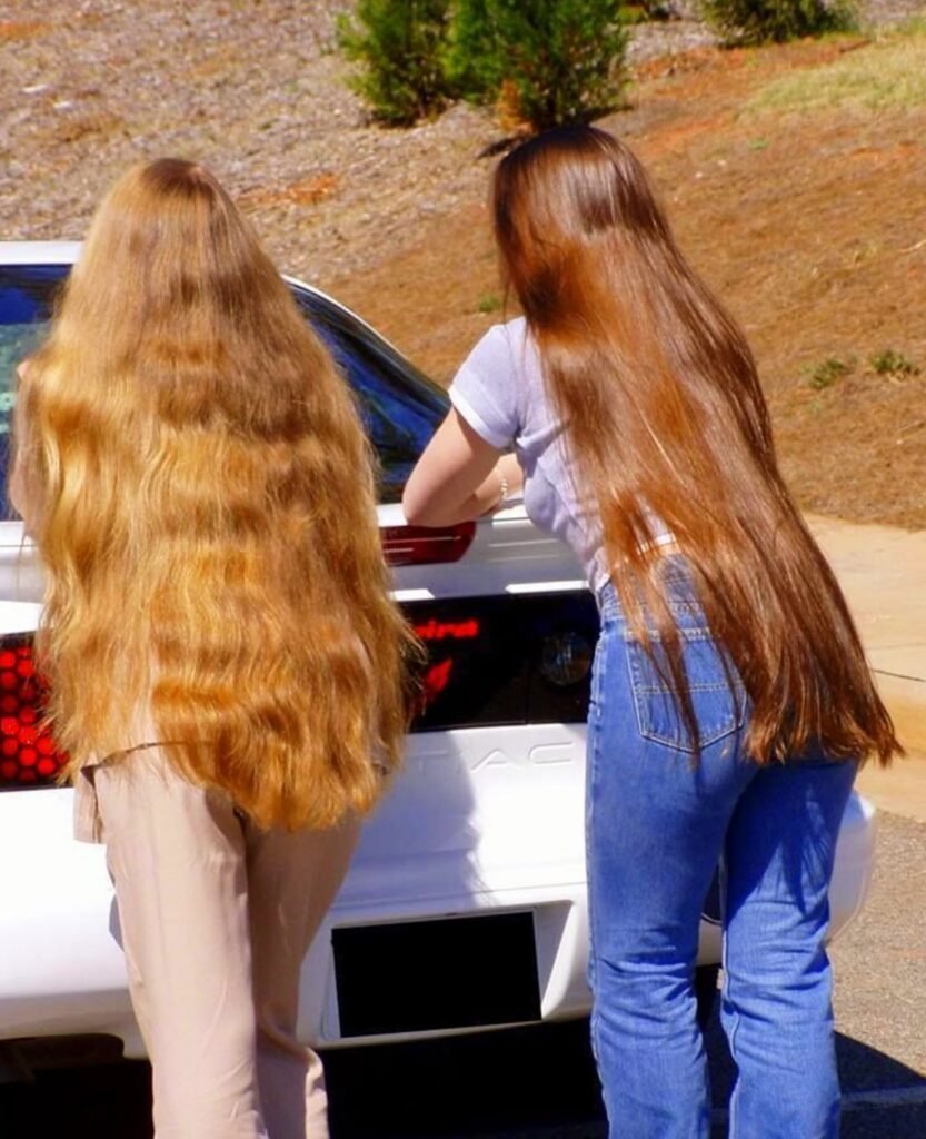 Sometimes vintage style is about embracing hair in its most natural state. This casual snapshot shows two people with incredibly long, unstyled hair that reaches well past their waists.