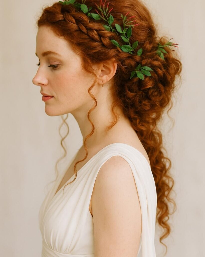 Those delicate leaves tucked into the braids add an earthy, romantic touch that feels straight out of a classical painting.