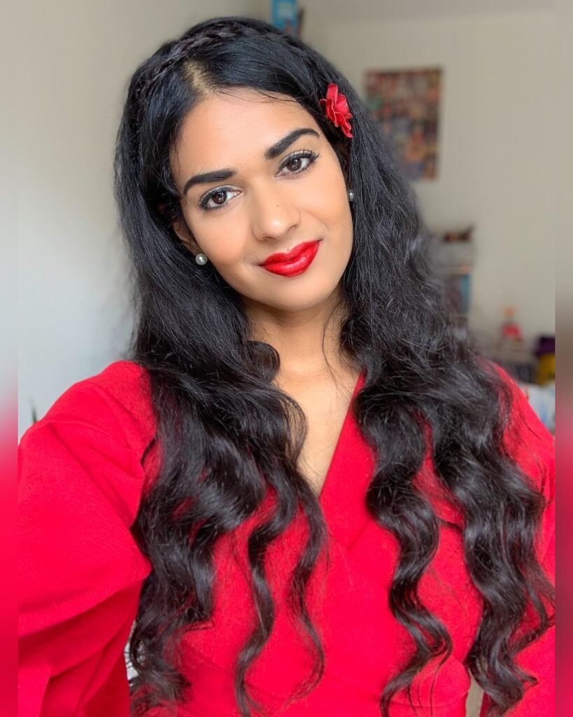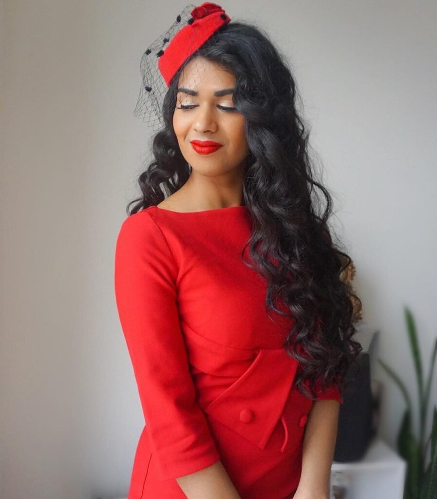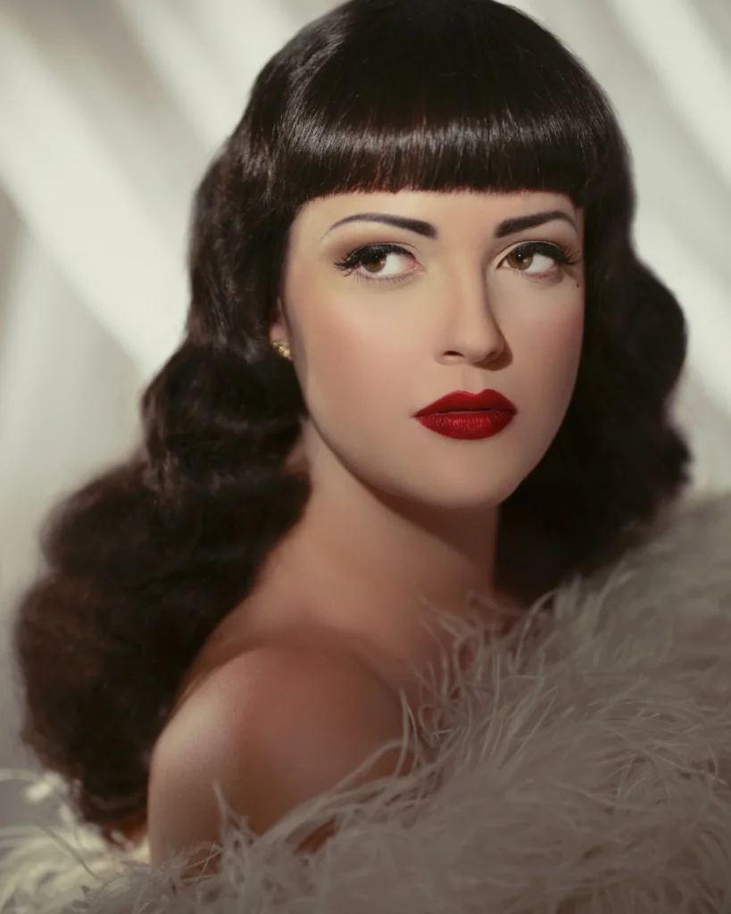 Bold red lips and jet-black hair make this vintage look absolutely striking. The blunt, curved bangs are cut in that classic pin-up style that frames the face beautifully, while the rest of the hair flows in soft waves around the shoulders.