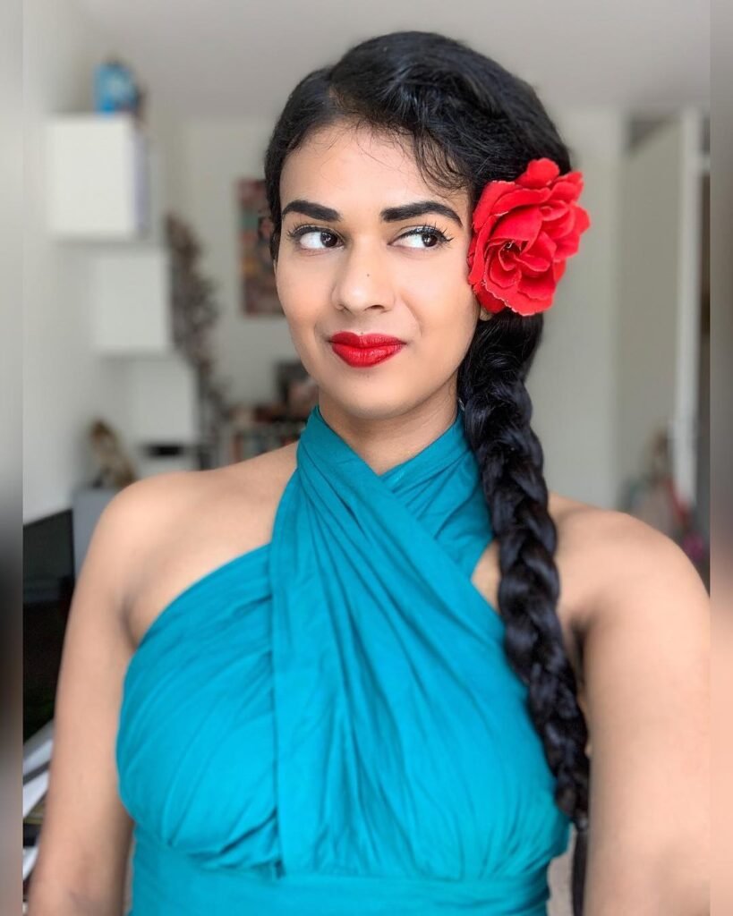 A small red flower tucked behind the ear adds that vintage pin-up detail without overwhelming the overall look.
