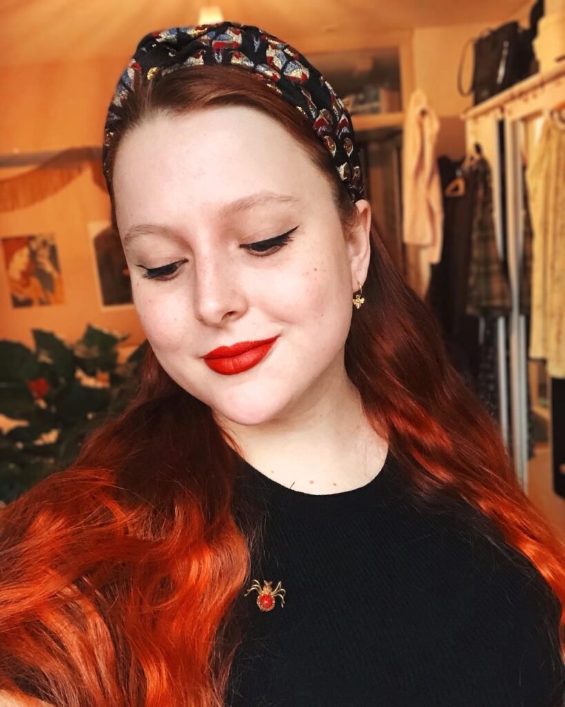 Patterned headbands were essential vintage accessories, and this one with its jeweled spider brooch adds quirky charm to flowing red-orange ombre hair.