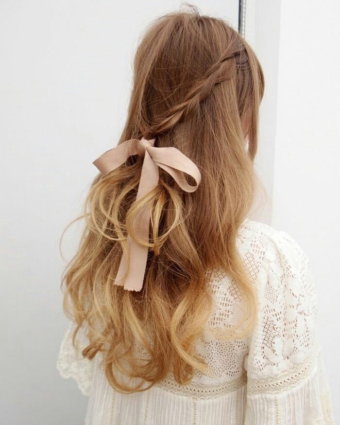 The hair is loosely gathered at the back with a delicate pale pink ribbon tied in a bow, creating a sweet, romantic finish.