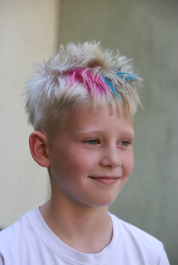 The sides are short and neat, letting the colorful top be the star. It’s perfect for creative kids who want to express themselves through their hair.