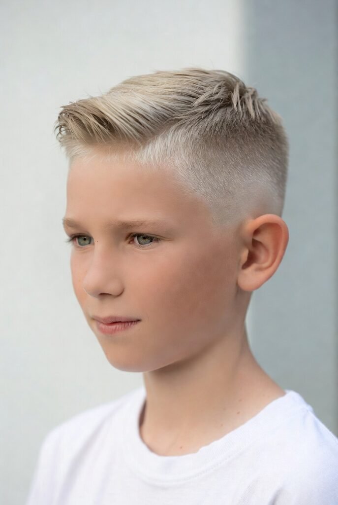 The hair flows smoothly to one side while the undercut keeps everything neat around the ears and neck. This cut works beautifully for kids with straight or slightly wavy hair.