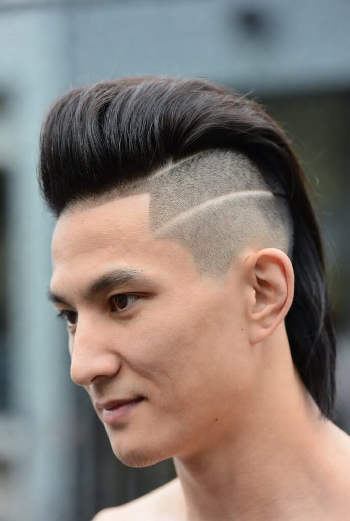 This cut brings serious attitude with its dramatic side part and shaved geometric patterns.