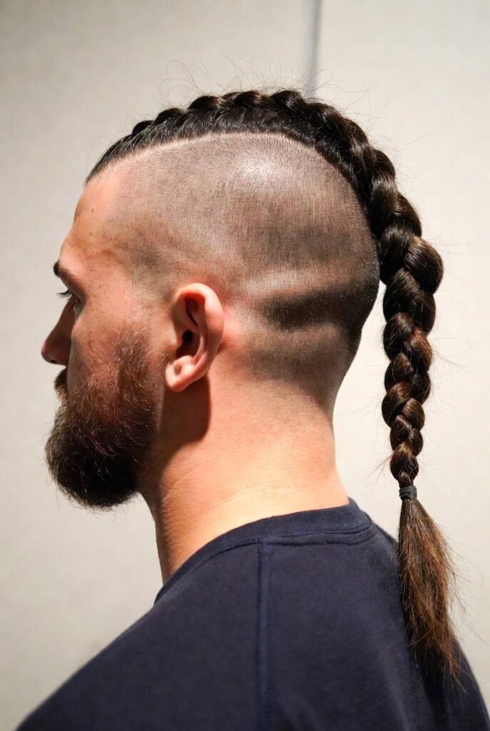 This style features a thick, singular braid running from front to back, flanked by absolutely pristine skin fades on both sides.